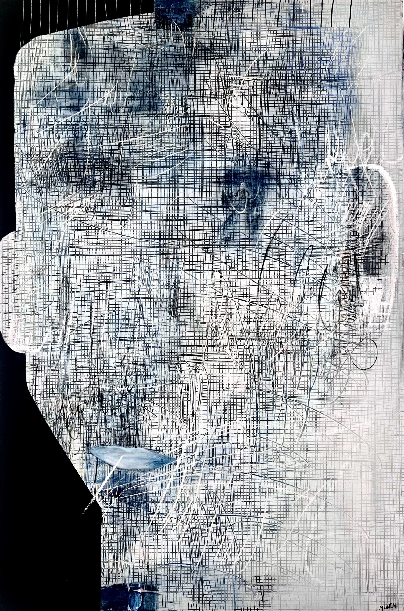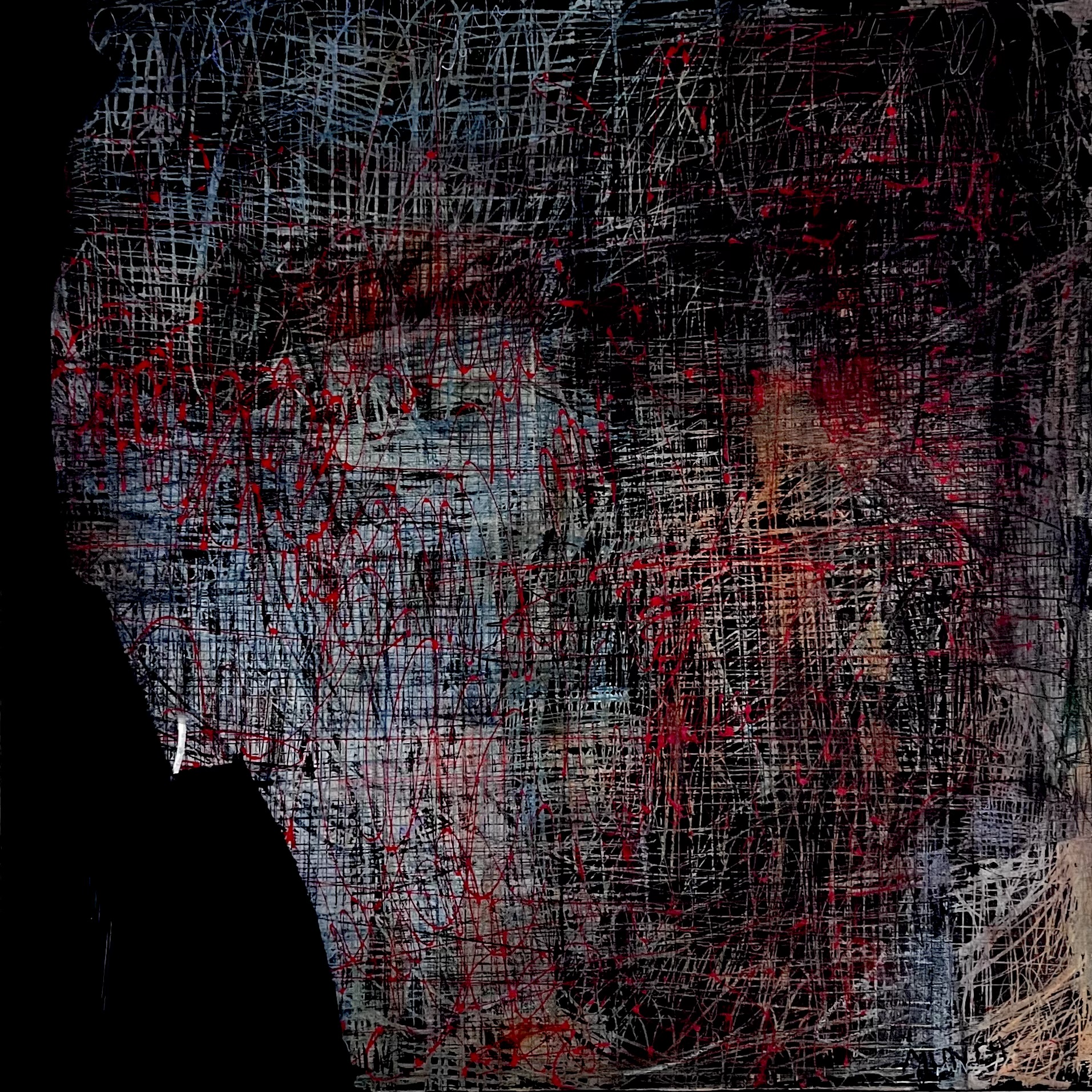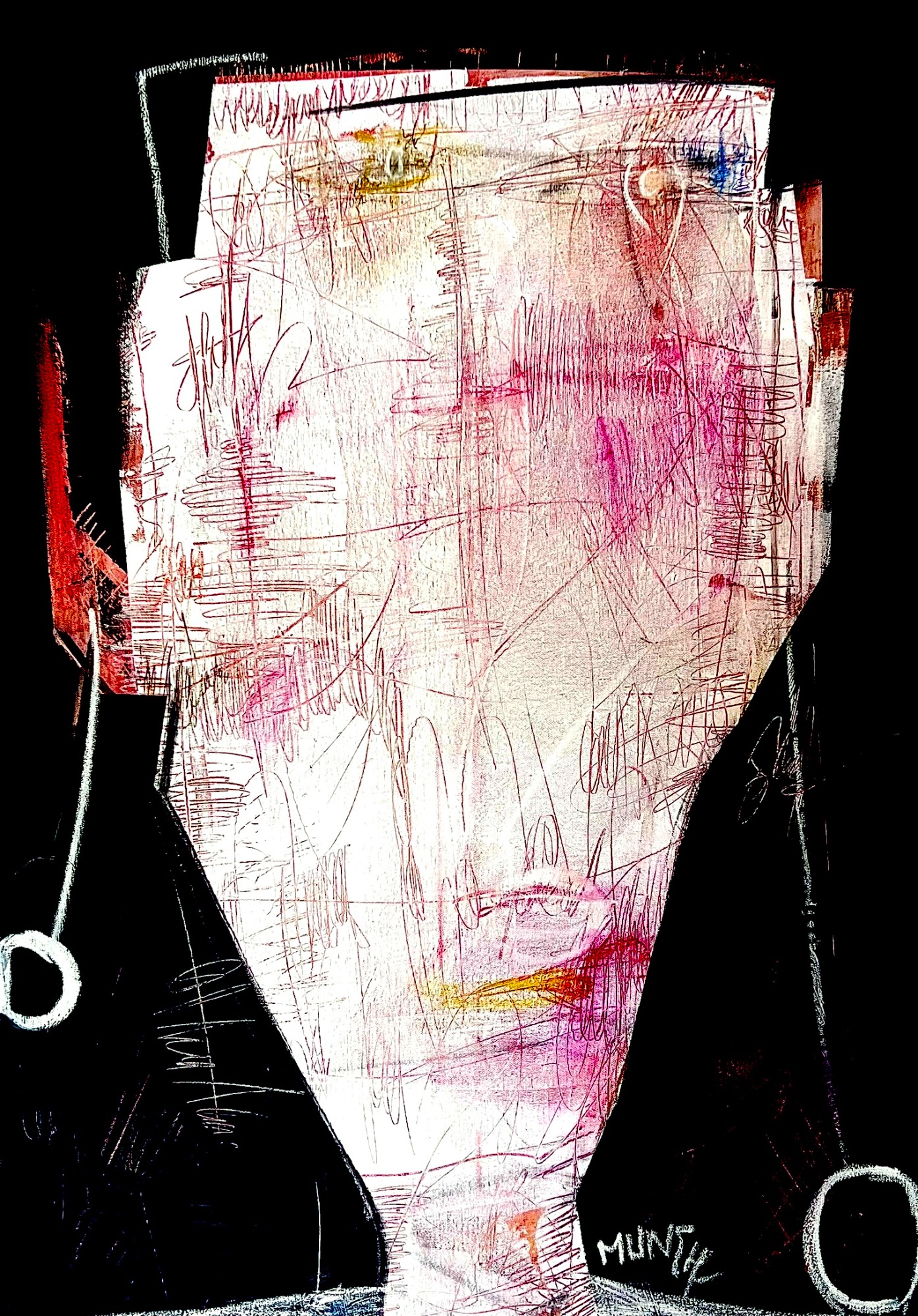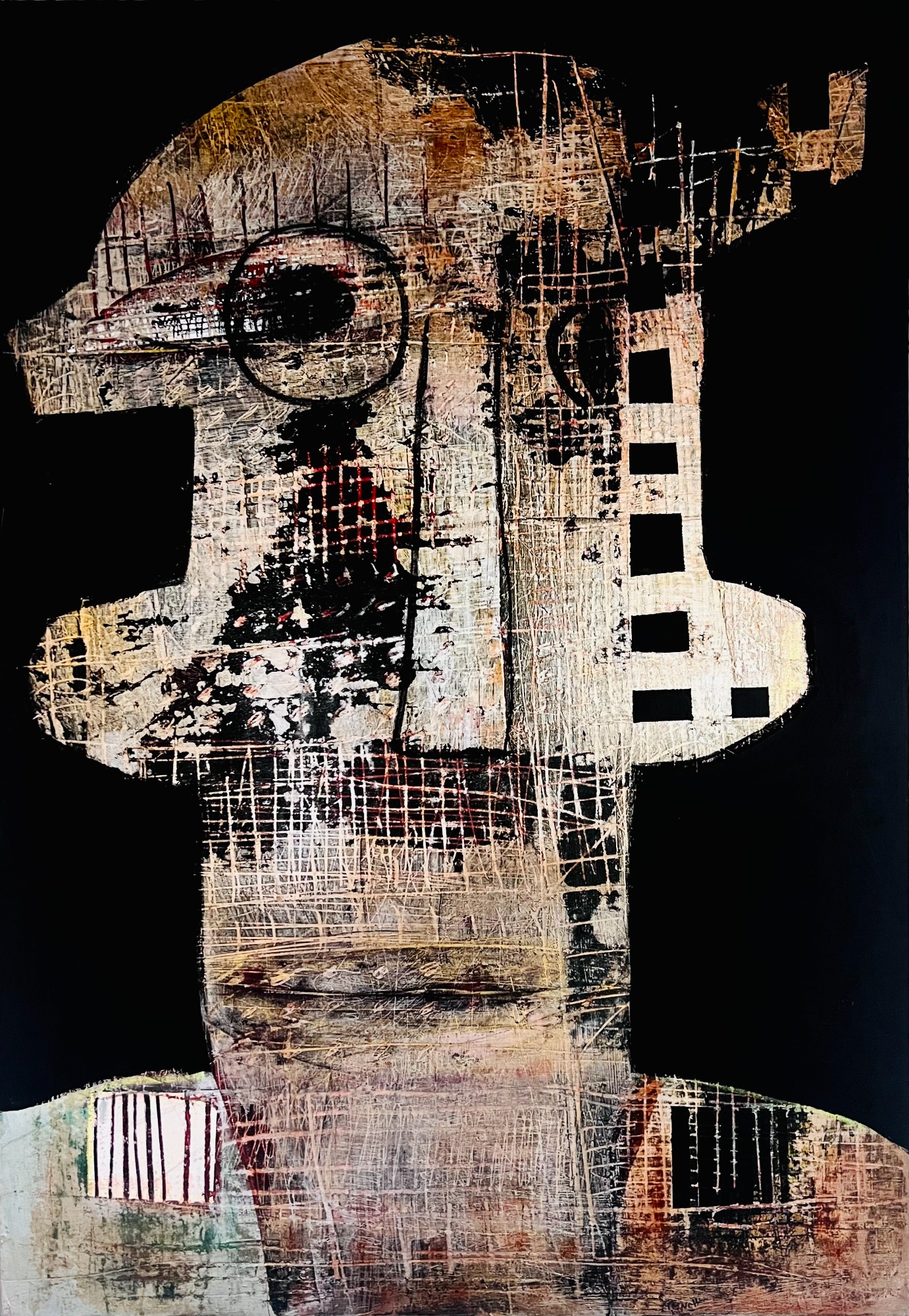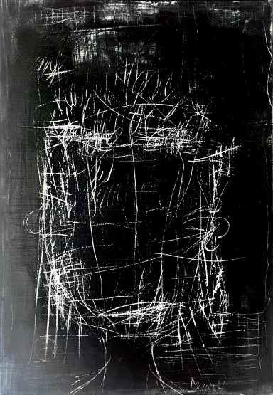 Cette peinture originale capture une figure en quête de son style avec l'énergie brute d'un graphisme expressionniste abstrait.