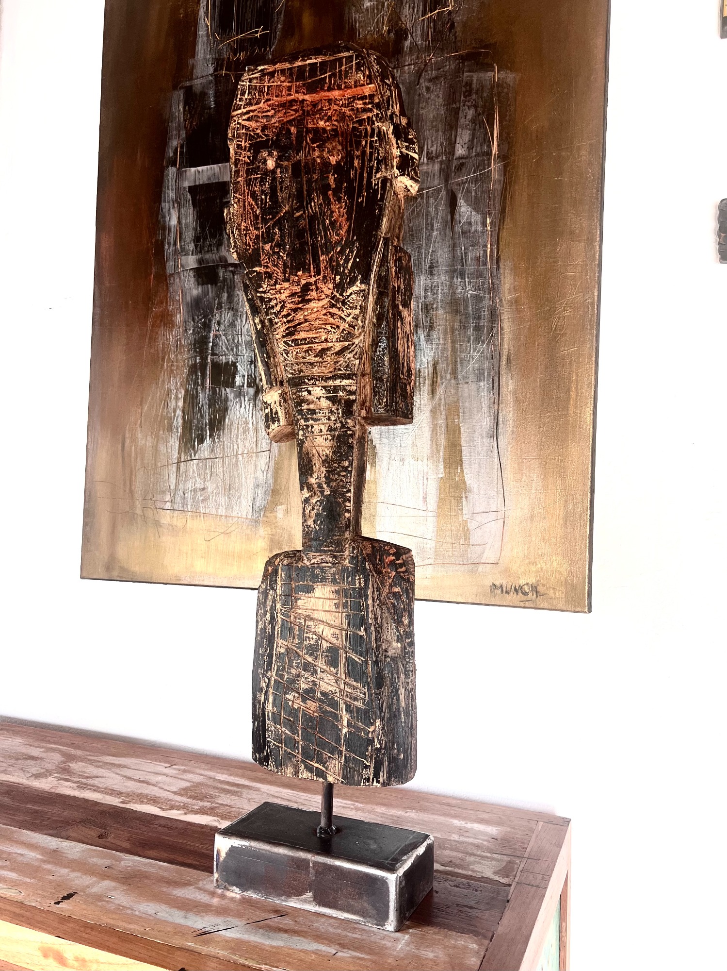 Sculptée dans du bois de Mélia, très dense et très lourd (6kg), cette figure abstraite parle de mémoire et du temps qui passe.
